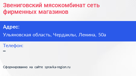 Звениговский мясокомбинат, сеть фирменных магазинов по адресу Ульяновская область, Чердаклы, Ленина, 50а в дальнейшем Организация, размещена в следующих категориях: