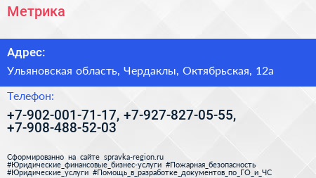 Метрика по адресу Ульяновская область, Чердаклы, Октябрьская, 12а в дальнейшем Организация, размещена в следующих категориях: