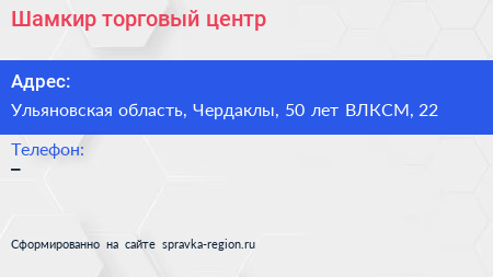 Шамкир, торговый центр по адресу Ульяновская область, Чердаклы, 50 лет ВЛКСМ, 22 в дальнейшем Организация, размещена в следующих категориях: