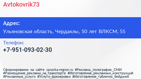 Avtokovrik73 по адресу Ульяновская область, Чердаклы, 50 лет ВЛКСМ, 55 в дальнейшем Организация, размещена в следующих категориях: