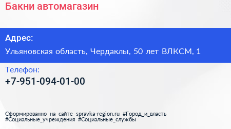Бакни, автомагазин по адресу Ульяновская область, Чердаклы, 50 лет ВЛКСМ, 1 в дальнейшем Организация, размещена в следующих категориях: