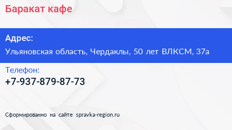 Баракат, кафе по адресу Ульяновская область, Чердаклы, 50 лет ВЛКСМ, 37а в дальнейшем Организация, размещена в следующих категориях: