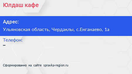 Юлдаш, кафе по адресу Ульяновская область, Чердаклы, с.Енганаево, 1а в дальнейшем Организация, размещена в следующих категориях: