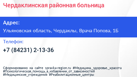 Чердаклинская районная больница по адресу Ульяновская область, Чердаклы, Врача Попова, 1Б в дальнейшем Организация, размещена в следующих категориях: