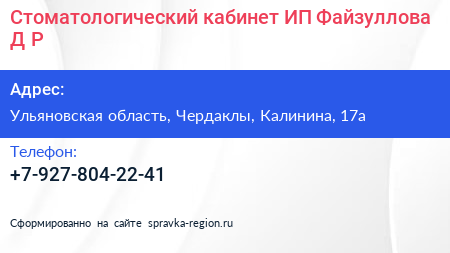 Стоматологический кабинет, ИП Файзуллова Д.Р. по адресу Ульяновская область, Чердаклы, Калинина, 17а в дальнейшем Организация, размещена в следующих категориях: