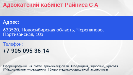 Адвокатский кабинет Райниса С.А. по адресу 633520, Новосибирская область, Черепаново, Партизанская, 10а в дальнейшем Организация, размещена в следующих категориях: