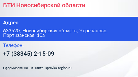 БТИ Новосибирской области по адресу 633520, Новосибирская область, Черепаново, Партизанская, 10а в дальнейшем Организация, размещена в следующих категориях: