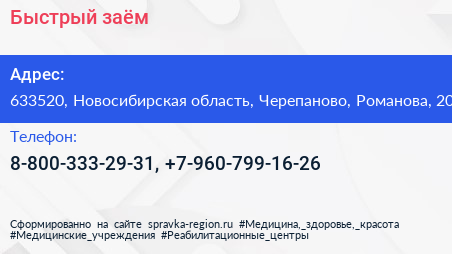 Быстрый заём по адресу 633520, Новосибирская область, Черепаново, Романова, 20 в дальнейшем Организация, размещена в следующих категориях: