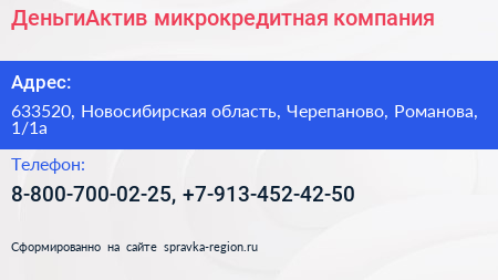 ДеньгиАктив, микрокредитная компания по адресу 633520, Новосибирская область, Черепаново, Романова, 1/1а в дальнейшем Организация, размещена в следующих категориях: