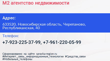 М2, агентство недвижимости по адресу 633520, Новосибирская область, Черепаново, Республиканская, 40 в дальнейшем Организация, размещена в следующих категориях: