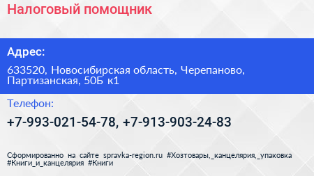 Налоговый помощник по адресу 633520, Новосибирская область, Черепаново, Партизанская, 50Б к1 в дальнейшем Организация, размещена в следующих категориях: