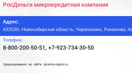 РосДеньги, микрокредитная компания по адресу 633520, Новосибирская область, Черепаново, Романова, 4а в дальнейшем Организация, размещена в следующих категориях: