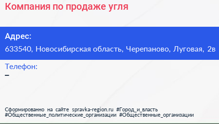 Компания по продаже угля по адресу 633540, Новосибирская область, Черепаново, Луговая, 2в в дальнейшем Организация, размещена в следующих категориях: