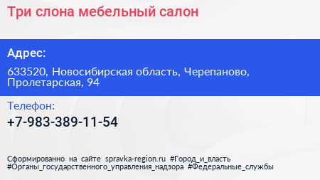 Три слона, мебельный салон по адресу 633520, Новосибирская область, Черепаново, Пролетарская, 94 в дальнейшем Организация, размещена в следующих категориях: