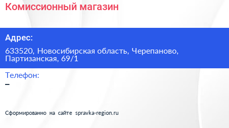 Комиссионный магазин по адресу 633520, Новосибирская область, Черепаново, Партизанская, 69/1 в дальнейшем Организация, размещена в следующих категориях: