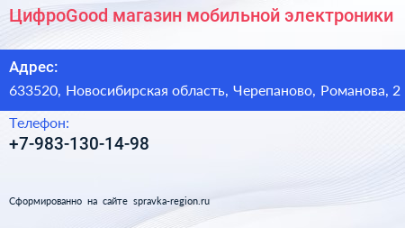 ЦифроGood, магазин мобильной электроники по адресу 633520, Новосибирская область, Черепаново, Романова, 2 в дальнейшем Организация, размещена в следующих категориях: