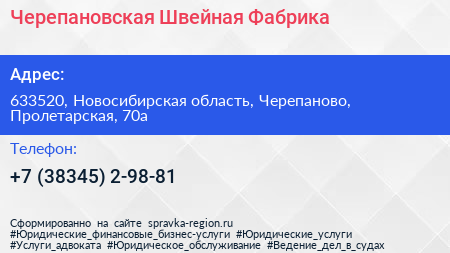 Черепановская Швейная Фабрика по адресу 633520, Новосибирская область, Черепаново, Пролетарская, 70а в дальнейшем Организация, размещена в следующих категориях: