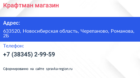 Крафтман, магазин по адресу 633520, Новосибирская область, Черепаново, Романова, 2Б в дальнейшем Организация, размещена в следующих категориях: