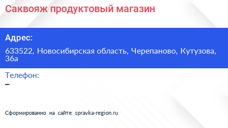 Саквояж, продуктовый магазин по адресу 633522, Новосибирская область, Черепаново, Кутузова, 36а в дальнейшем Организация, размещена в следующих категориях: