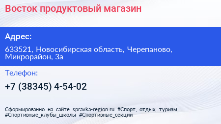 Восток, продуктовый магазин по адресу 633521, Новосибирская область, Черепаново, Микрорайон, 3а в дальнейшем Организация, размещена в следующих категориях: