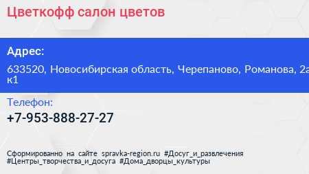 Цветкофф, салон цветов по адресу 633520, Новосибирская область, Черепаново, Романова, 2а к1 в дальнейшем Организация, размещена в следующих категориях: