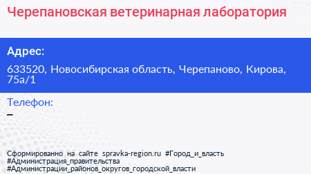 Черепановская ветеринарная лаборатория по адресу 633520, Новосибирская область, Черепаново, Кирова, 75а/1 в дальнейшем Организация, размещена в следующих категориях: