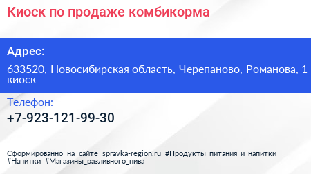 Киоск по продаже комбикорма по адресу 633520, Новосибирская область, Черепаново, Романова, 1 киоск в дальнейшем Организация, размещена в следующих категориях: