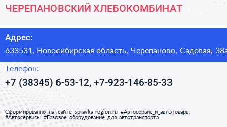 ЧЕРЕПАНОВСКИЙ ХЛЕБОКОМБИНАТ по адресу 633531, Новосибирская область, Черепаново, Садовая, 38а в дальнейшем Организация, размещена в следующих категориях: