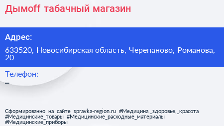 Дымоff, табачный магазин по адресу 633520, Новосибирская область, Черепаново, Романова, 20 в дальнейшем Организация, размещена в следующих категориях: