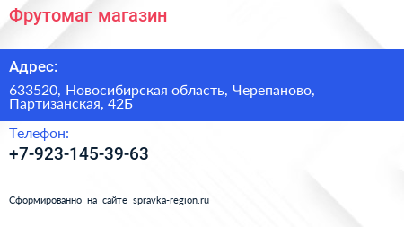 Фрутомаг, магазин по адресу 633520, Новосибирская область, Черепаново, Партизанская, 42Б в дальнейшем Организация, размещена в следующих категориях: