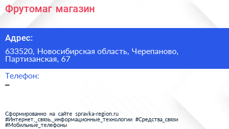 Фрутомаг, магазин по адресу 633520, Новосибирская область, Черепаново, Партизанская, 67 в дальнейшем Организация, размещена в следующих категориях: