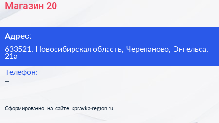 Магазин №20 по адресу 633521, Новосибирская область, Черепаново, Энгельса, 21а в дальнейшем Организация, размещена в следующих категориях: