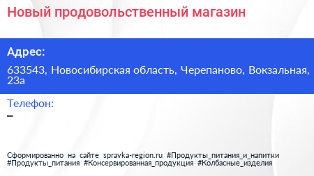 Новый, продовольственный магазин по адресу 633543, Новосибирская область, Черепаново, Вокзальная, 23а в дальнейшем Организация, размещена в следующих категориях: