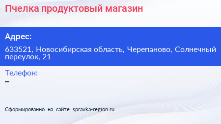 Пчелка, продуктовый магазин по адресу 633521, Новосибирская область, Черепаново, Солнечный переулок, 21 в дальнейшем Организация, размещена в следующих категориях: