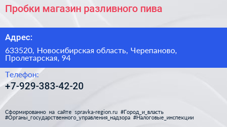 Пробки, магазин разливного пива по адресу 633520, Новосибирская область, Черепаново, Пролетарская, 94 в дальнейшем Организация, размещена в следующих категориях: