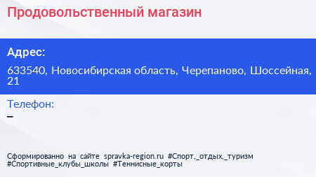 Продовольственный магазин по адресу 633540, Новосибирская область, Черепаново, Шоссейная, 21 в дальнейшем Организация, размещена в следующих категориях: