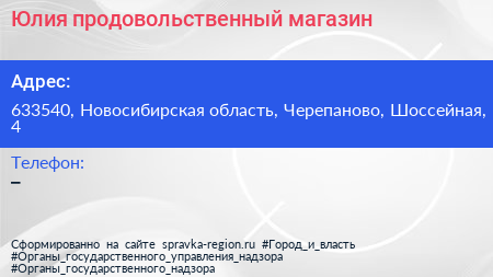 Юлия, продовольственный магазин по адресу 633540, Новосибирская область, Черепаново, Шоссейная, 4 в дальнейшем Организация, размещена в следующих категориях: