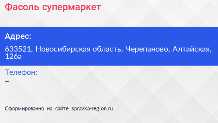 Фасоль, супермаркет по адресу 633521, Новосибирская область, Черепаново, Алтайская, 126а в дальнейшем Организация, размещена в следующих категориях: