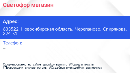 Светофор, магазин по адресу 633522, Новосибирская область, Черепаново, Спирякова, 224 к1 в дальнейшем Организация, размещена в следующих категориях: