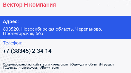 Вектор-Н, компания по адресу 633520, Новосибирская область, Черепаново, Пролетарская, 66а в дальнейшем Организация, размещена в следующих категориях: