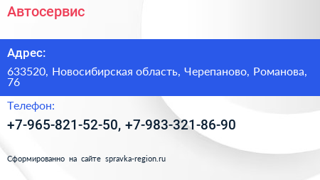 Автосервис по адресу 633520, Новосибирская область, Черепаново, Романова, 76 в дальнейшем Организация, размещена в следующих категориях: