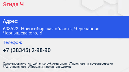 Эгида-Ч по адресу 633522, Новосибирская область, Черепаново, Чернышевского, 6 в дальнейшем Организация, размещена в следующих категориях: