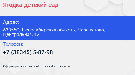 Ягодка, детский сад по адресу 633550, Новосибирская область, Черепаново, Центральная, 12 в дальнейшем Организация, размещена в следующих категориях: