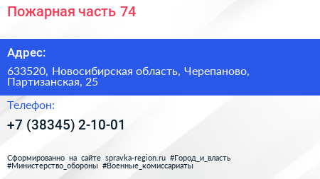 Пожарная часть №74 по адресу 633520, Новосибирская область, Черепаново, Партизанская, 25 в дальнейшем Организация, размещена в следующих категориях: