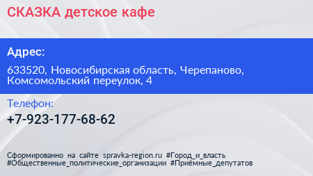 СКАЗКА, детское кафе по адресу 633520, Новосибирская область, Черепаново, Комсомольский переулок, 4 в дальнейшем Организация, размещена в следующих категориях: