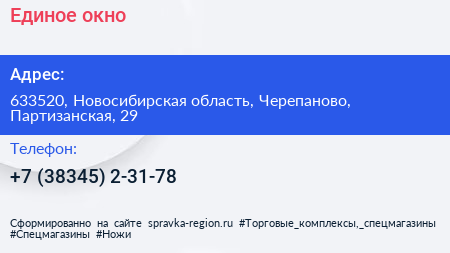 Единое окно по адресу 633520, Новосибирская область, Черепаново, Партизанская, 29 в дальнейшем Организация, размещена в следующих категориях: