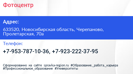 Фотоцентр по адресу 633520, Новосибирская область, Черепаново, Пролетарская, 70а в дальнейшем Организация, размещена в следующих категориях: