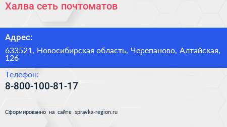 Халва, сеть почтоматов по адресу 633521, Новосибирская область, Черепаново, Алтайская, 126 в дальнейшем Организация, размещена в следующих категориях: