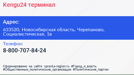 Kengu24, терминал по адресу 633520, Новосибирская область, Черепаново, Социалистическая, 1в в дальнейшем Организация, размещена в следующих категориях: