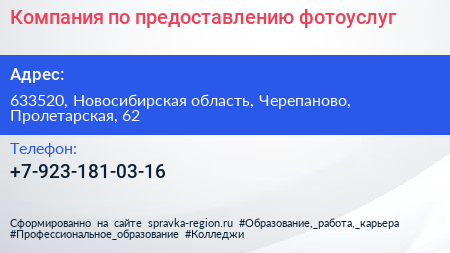 Компания по предоставлению фотоуслуг по адресу 633520, Новосибирская область, Черепаново, Пролетарская, 62 в дальнейшем Организация, размещена в следующих категориях:
